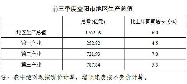 根据地区生产总值初步统一核算结果,2025年前三季度益阳市地区生产总值1762.59亿元,按不变价格计算,同比增长6.0%。